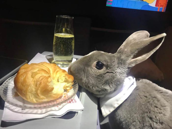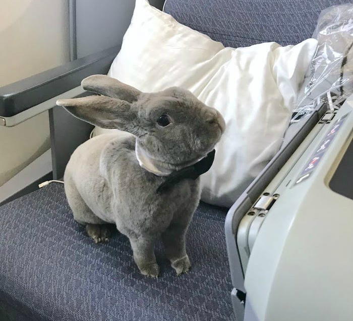 In very important news, an adorable rabbit in people clothes flew on a first class flight from San Francisco to Japan.
