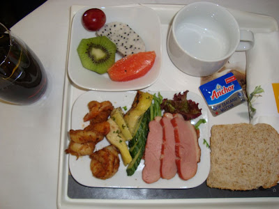 We had spicy tuna and Chili spiced chicken for appetizer, and they were actually better than the main entrée Potato Gnocchi. Then we had chocolate mousse cake and fruits for dessert, followed by Lindt’s chocolate and coffee. They also offered cup noodles and banana for mid-flight snacks. And before landing, we had the duck and prawn for the second dinner meal service.