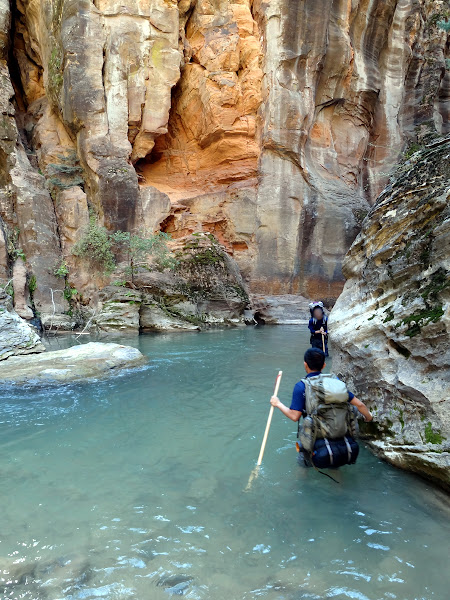 The trail head for the 16-mile hike actually starts outside of the park at Chamberlain's Ranch. We booked a shared shuttle through the Zion Adventure Company, and they drive you from their office in Sprindale all the way there, with the one-way trip taking approximately 1h 30m. We also rented all our equipment from them as well, including the tent, water hiking shoes, neoprene socks, and hiking sticks. For those who don't know, the vast majority of the hike is in the Virgin River, with the river serving as the trail itself. During various parts of the year, the water level can go up to chest-deep... and through certain portions of the trail, we actually had to swim short distances (yes, with our backpacks on)!