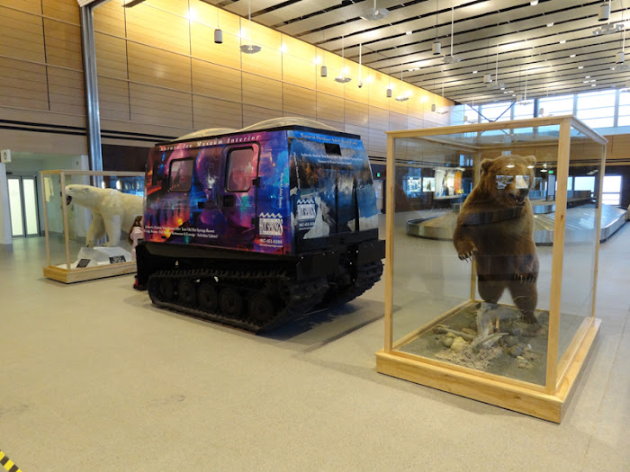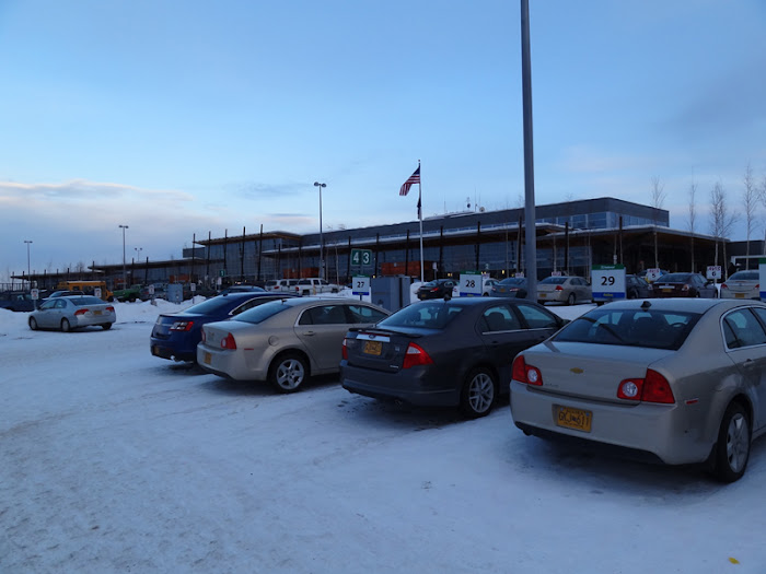 Two beverage services were provided on this three and a half hour flight, along with plenty of snack mixes. There was also real food for sale on board, but I had purchased a sandwich at the airport terminal prior to departure. After napping for a bit, we began our descent into Ted Stevens Anchorage International Airport under overcast skies. When I exited the aircraft through the jet bridge, it took a moment to register just how cold the temperature was outside. And it would only get colder from there.