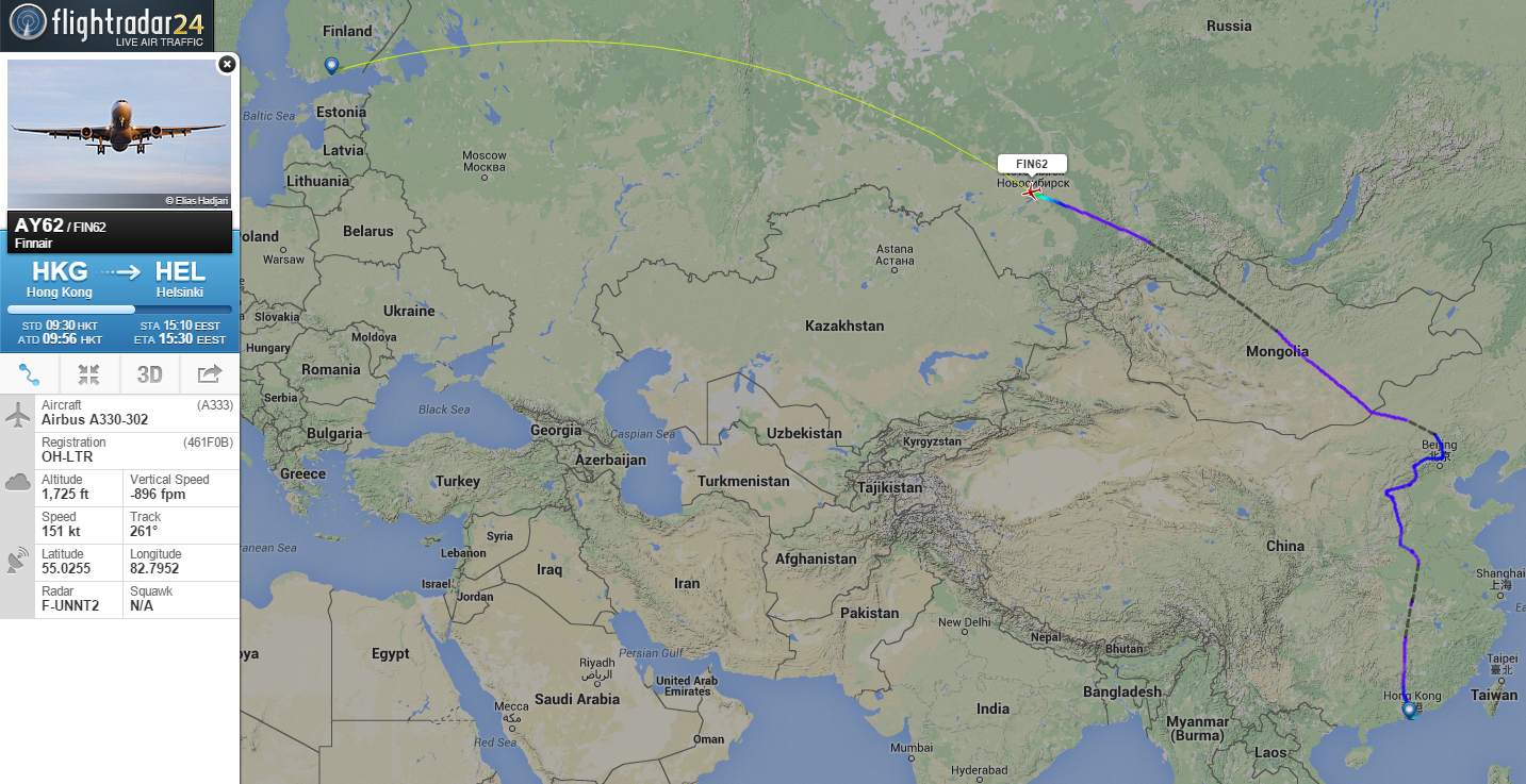 came to my mind from last summer. AY flight had to stop for refueling on its way to HEL because of that zic-zac above China.
