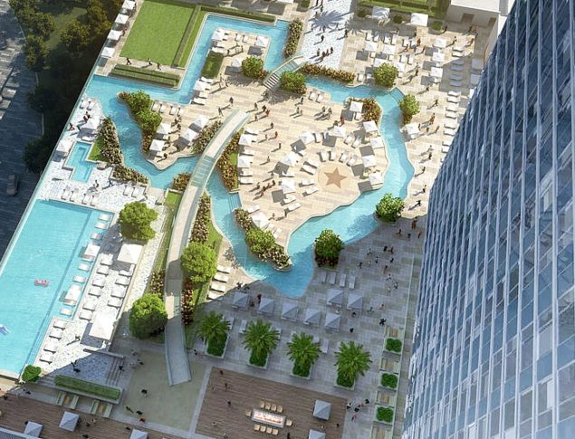 Marriott Marquis Houston's "stately" rooftop (terrace, actually) pool nears completion. Hotel will open on a limited basis by year-end.