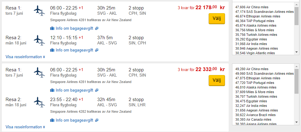 SQ: Norway/Sweden - Australia/NZ 22,000 SEK; $2686 USD; €2237 in Business
