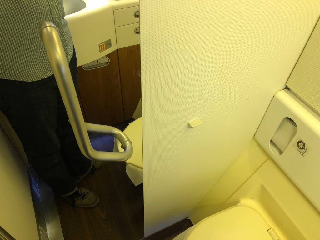 Since it was an overnight flight, I also went to the lavatory—strangely positioned along the aft wall of the first class cabin—to change. Pretty small but perfectly nice.