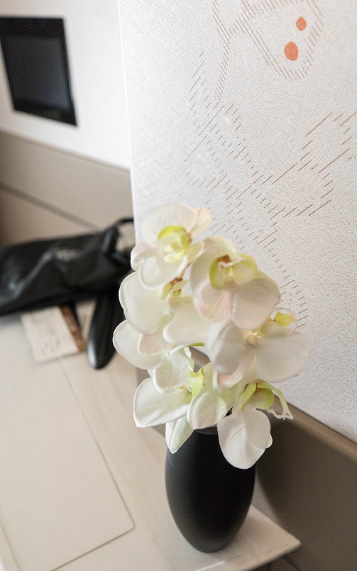 The orchids aren't real (unlike Lufthansa), although I think it's not a bad idea. The orchid vase is permanently attached to the table. I like the background texturing and subtle colors on the walls.