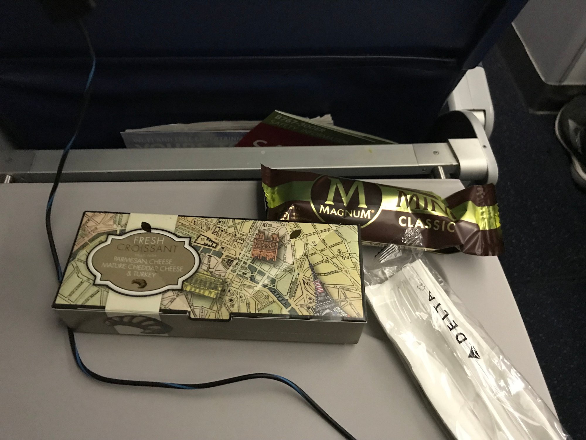The verdict: Aside from being served ranch dressing, instead of the promised caesar, those salads are definitely the way to go on Delta economy TATL. I was in the last row of Comfort+ and got the last salad in the cart for our aisle. The person across the aisle from me got the last one from the cart on the other side of the plane. So they go fast! All the rest of the meal accompaniments were fine. The pretzel roll was like every other Delta economy pretzel roll I've had over the years. The fruit salad was ... fine. The cake was disappointing. So, other than the salad being good, the highlight of the food might have been the turkey and cheese croissant, plus ice cream bar in the pre-arrival snack. Service was good and attentive. Much fun as it was in Upper Class going over, I'm reasonably certain I'll be back in economy many, many more times.