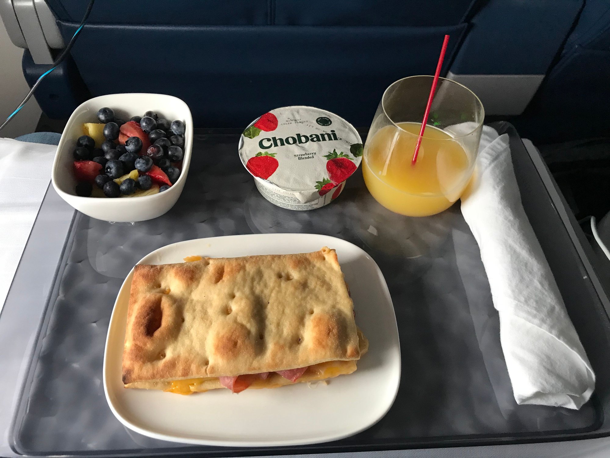 As opposed to my January experience with this meal, the food was thoroughly cooked, which is nice. The fruit was quite flavorful. The yogurt was, well, yogurt. FAs were attentive. Full PDBs were offered and refills were plentiful throughout the flight. Nice way to start a quick trip to New England. No upgrade on the return. :-(