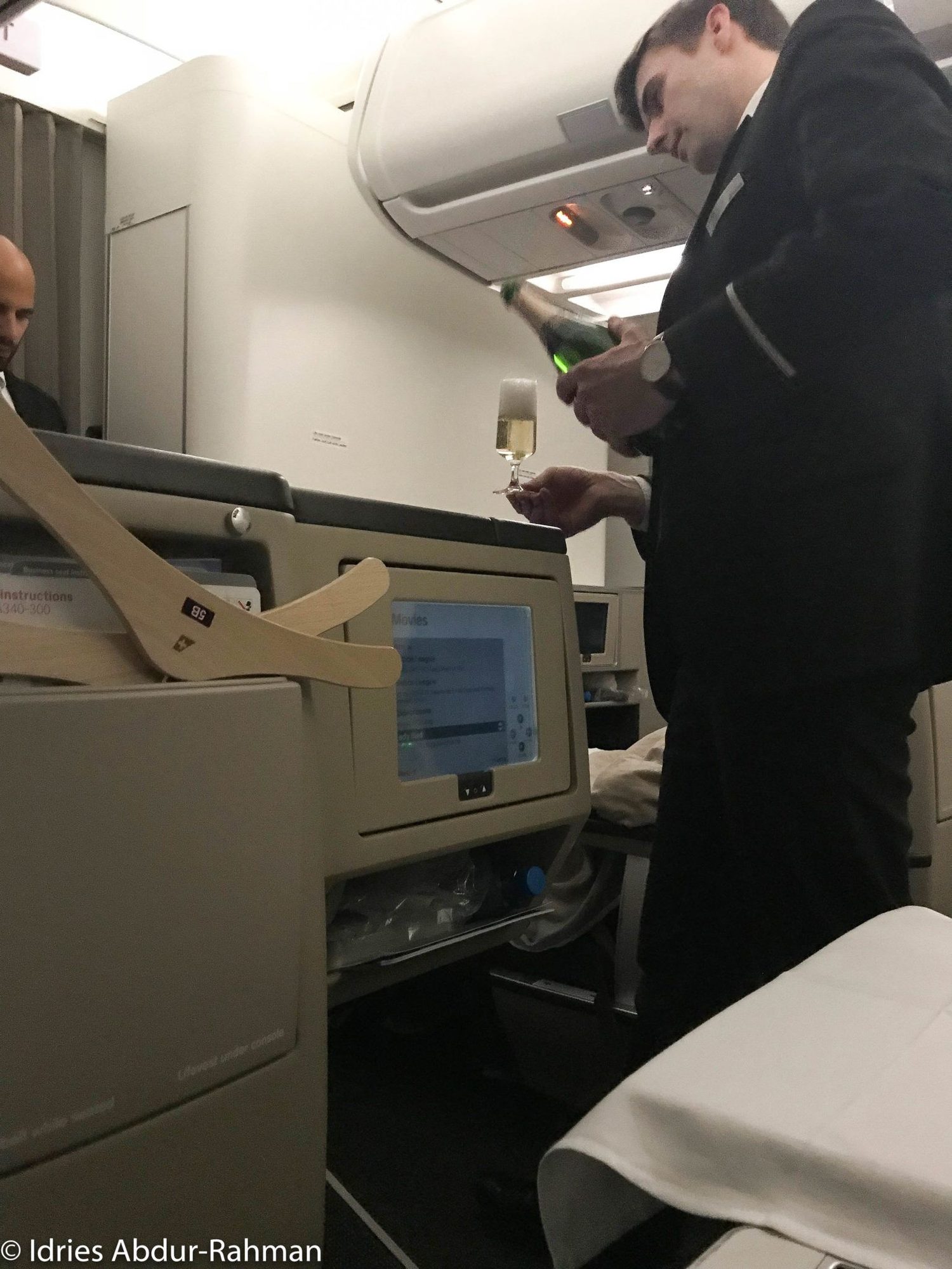 We were seated in the two-row Business Class mini-cabin. Soon after getting settled in, the cabin crew offered pre-departure beverages including orange juice and champaign.