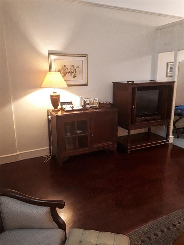 Upon entering the room you have a nice living room with sofa, chair, desk, TV, and a table with water boiler and tea and coffee.