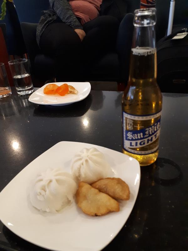 The booze selection is rather poor, with almost no hard liquors available and the only wine which was put out being a sweet Spanish red which I'm sure would retail for less than a dollar. I downed a few San Miguel lights (since there was no proper normal beer available... light beer is really the worst American invention ever) and ate the dodgy looking meat pastries and bakpau buns (they were quite OK – and I did not get sick). Out of sheer despair and boredom I might have eaten a bit of the food of the Gods!