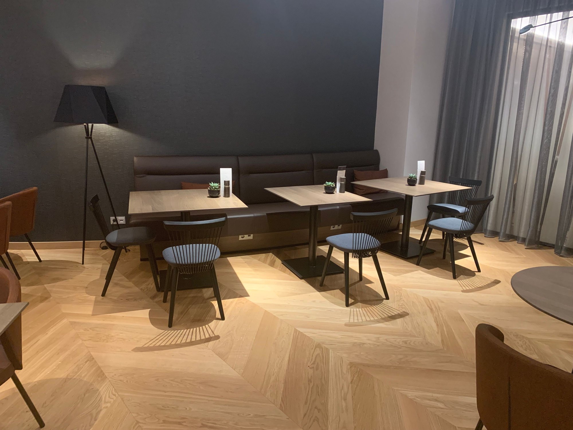 To add to this update: Was there last weekend. The property started upgrading rooms 3 years ago. The lobby and MLounge were finally finished in October. The "American" sports bar was updated with trestle tables. The bistro lounge up front looks the same but the lobby seating is updated. Here are a few pics of the MLounge to start. Note multiple charging stations.