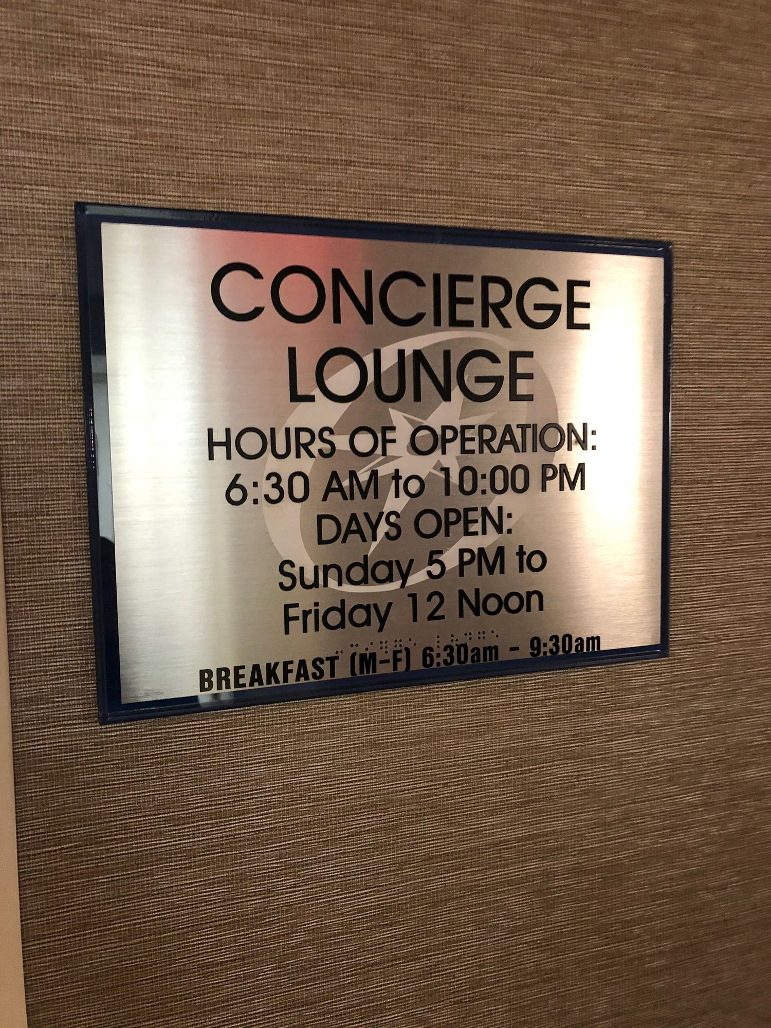 The concierge lounge is on the top floor, but is not keycard accessible over the weekend when it is closed. Staff in the lounge and front desk were very friendly. The lounge spread was pretty basic. No oatmeal for breakfast. Just bacon, eggs, potatoes, some fruit, bread, and yogurt. No bananas even. At night, there was a creamy pasta and mini-hamburgers, cheese cubes, and a limited salad bar. Later on they brought out cookies, cheesecake and chocolate cake.