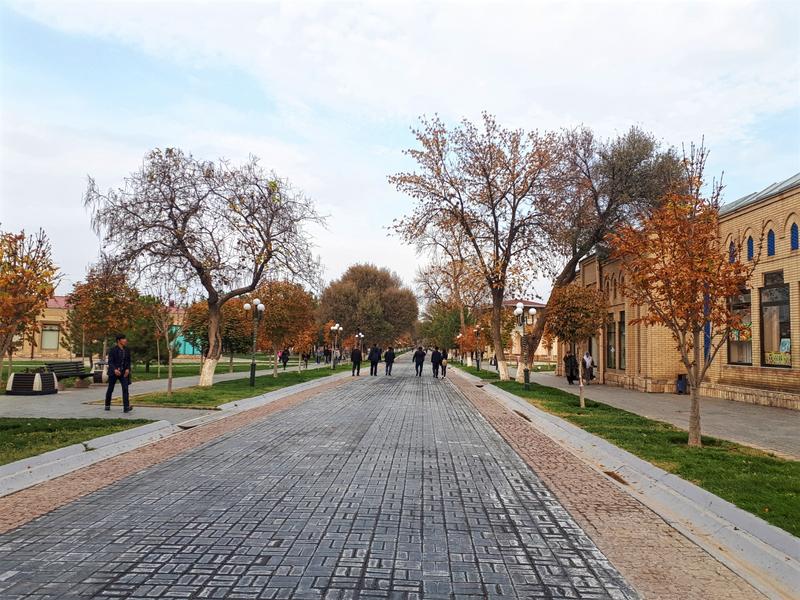From the east of the Registan a pedestrian street (Tashkent Street) runs north towards a couple of other main Samarkand sights. There are a few (not terribly interesting) souvenir shops and small supermarkets in this street. A fleet of giant-sized electric golf karts which easily seat around 20 people run up and down the street offering complimentary rides, even though the distance is fairly short and perfectly walkable.