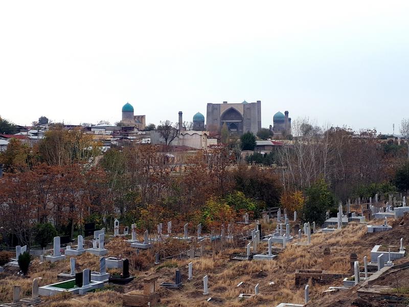 I had one major site left to see in Samarkand: the Shah-i-Zinda necropolis. On the way to it I passed by an old graveyard from where the grounds also gave some good views back over Samarkand, with the Bibi Khanym Mosque as well as the three Registan madrassa's being clearly visible.