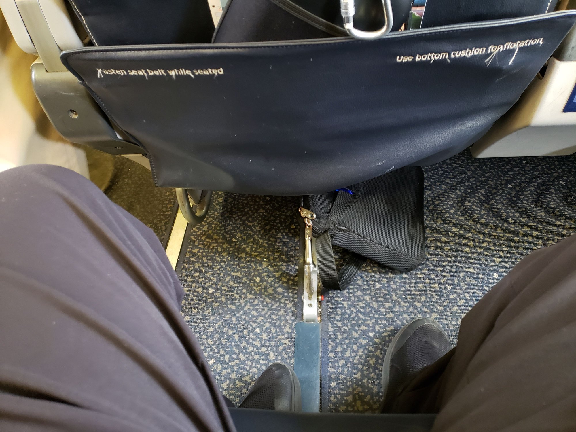 This is the aisle seat in a CR7 in F, but I had the same situation on an E175 but forgot to take the picture. As you can see, a laptop bag fits fine, but a medium sized backpack is going to have to go to the right of the stanchion and probably protrude under the window seat's underseat storage area.