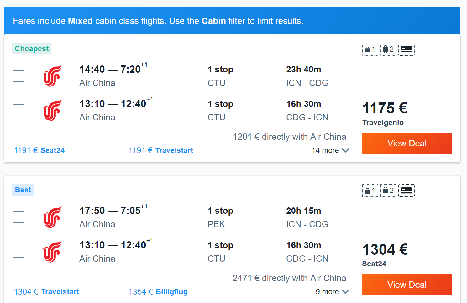 My Link behind Air China directs to Kayak and shows