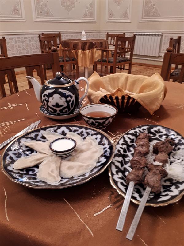 There aren't too many restaurants in the walled city of Khiva, so I stopped at a random hotel restaurant in town, where the dining room was completely deserted. The food, some manti (dumplings) and shashlyk, was however tasty enough, even though it was one of the least impressive meals I had on the trip. But you can't complain much after walking the entire day and being hungry.