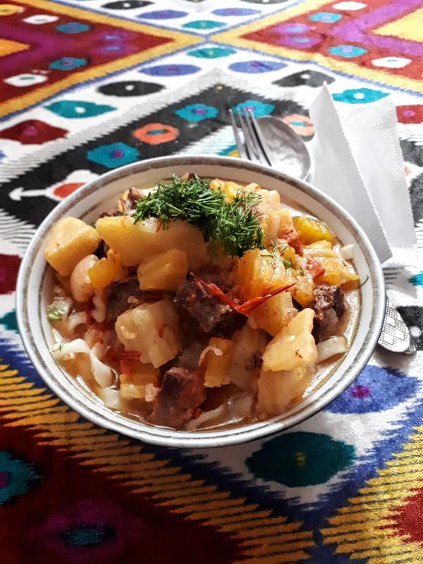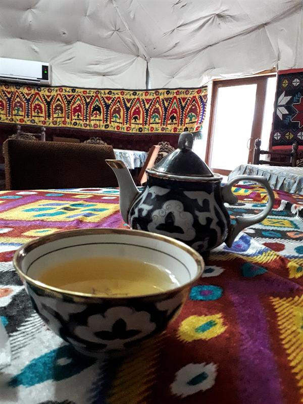 After the climb I decided it was time for a break. There was an appealing looking restaurant nearby where you could dine in an authentic yurt set up on the inner courtyard. I had some laghman (this time served as a soup) and a pot of tea.