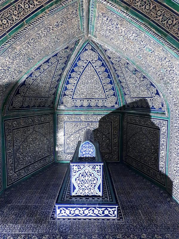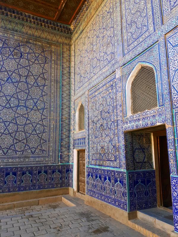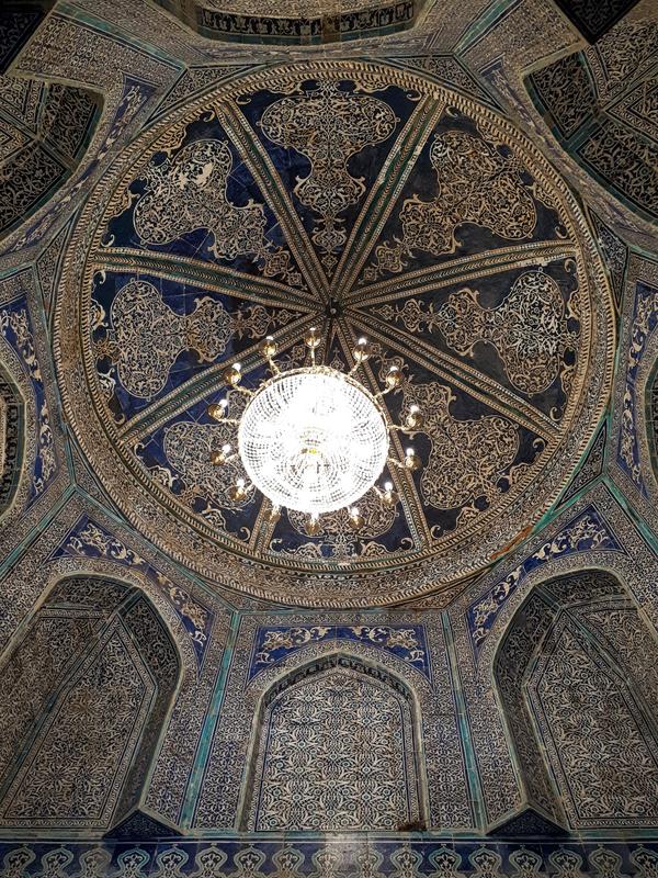 Also the most beautiful sight in town is located in this area. The Pahlavon Mahmud Mausoleum is named after a man who was a poet, philosopher and legendary wrestler in one. Pahlavon Mahmud is considered Khiva's patron saint and it's easily the most-visited place in town by locals. The tomb is from 1326, but was rebuilt in the 19th Century. Also some of the Khans of Khiva are buried here as they requisitioned it in the early 20th Century.