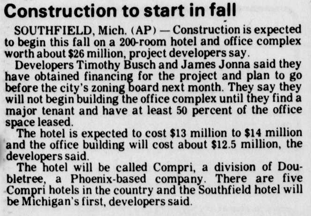 https://digital.bentley.umich.edu/dj...1.07.26.001/61 (right bottom corner). From August 2, 1991, the ad says: "We are pleased to announce that our hotel is now know as "Southfield Hilton Garden Inn".