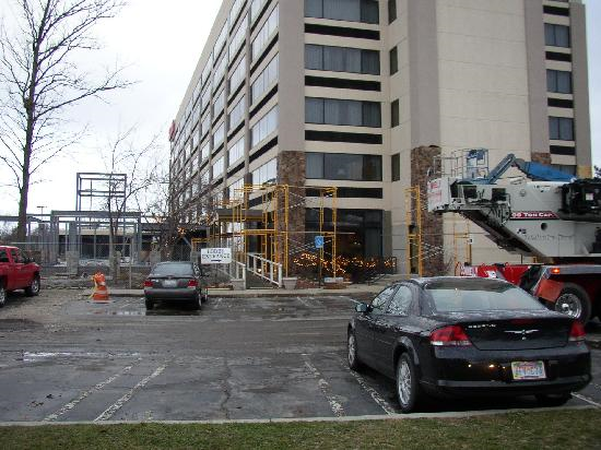 The first three had lost their Hilton affiliation around the turn of the century. My guess is that the HGI-management must have thought: if we start calling ourselves simply Southfield Hilton Inn, then nearly every directory search for those former hotels is likely to end up at our property. Or, a more compelling reason might be that they did no longer cohere to brand standards that had evolved by then, because when they joined HGI everything was still experimental. For example: the (compri) hotels served breakfast, but didn't have a full restaurant, so they were more like a Hampton Inn. Old guest reviews on TripAdvisor mention an extensive renovation that stretched over three years (2006-2008) and about halfway a reviewer posted this pic. You'll notice the building's (Compri) architecture, but as you can see, the typical HGI lobby-entrance for that period is being added. It is barely visible, but the top left corner of the building says ‘HILTON’ in red in all caps. (So it doesn't say Hilton INN. This observation also based on a picture found on an old-time OTA website, far too lo-res to duplicate here).