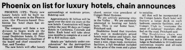 (compri) hotels were part of Doubletree Inc. of Phoenix, AZ, an independent hotel company, then 80% owned by Metropolitan Life Insurance of New York. Doubletree, along with FFKR architects of Scottsdale (