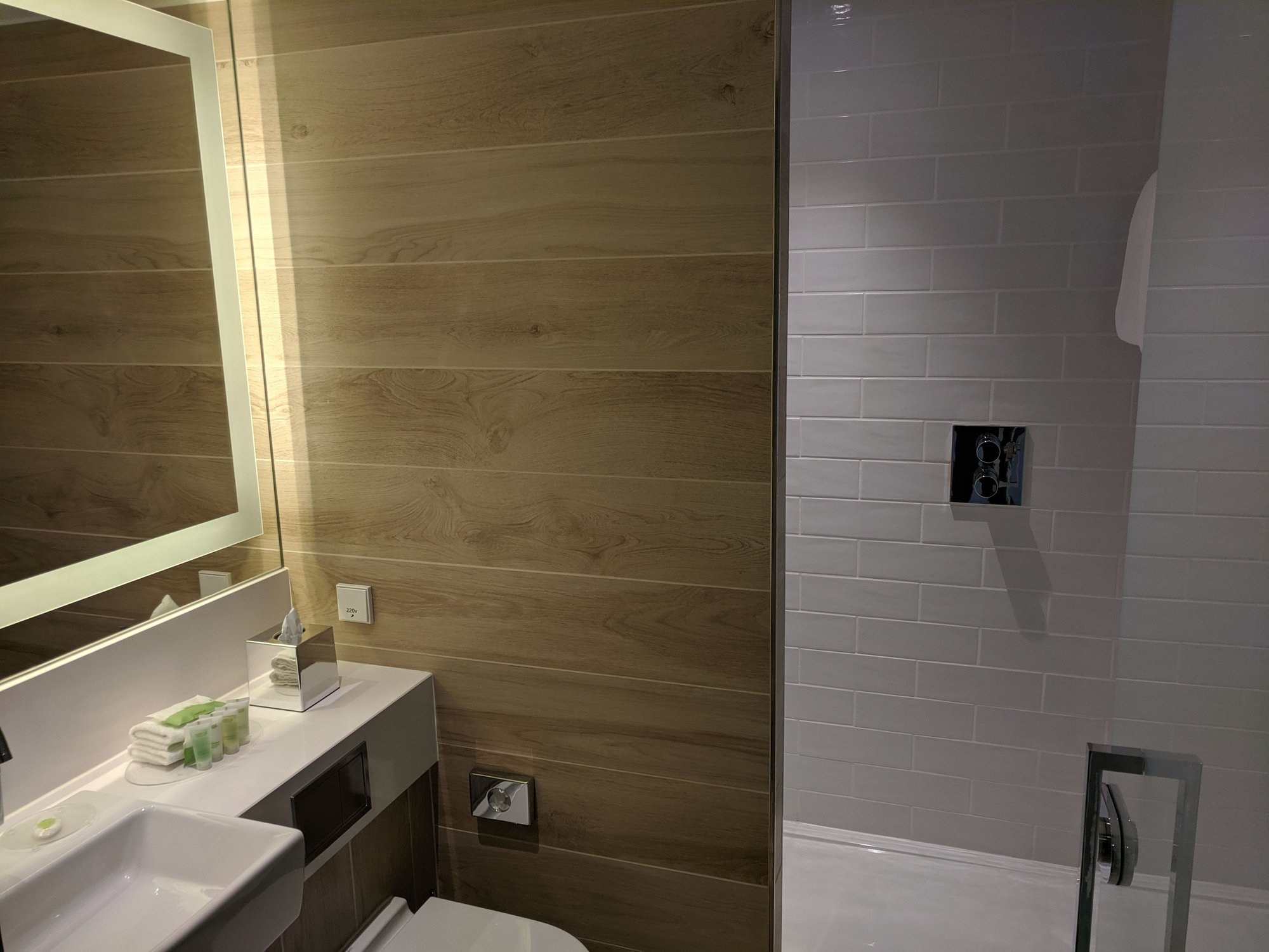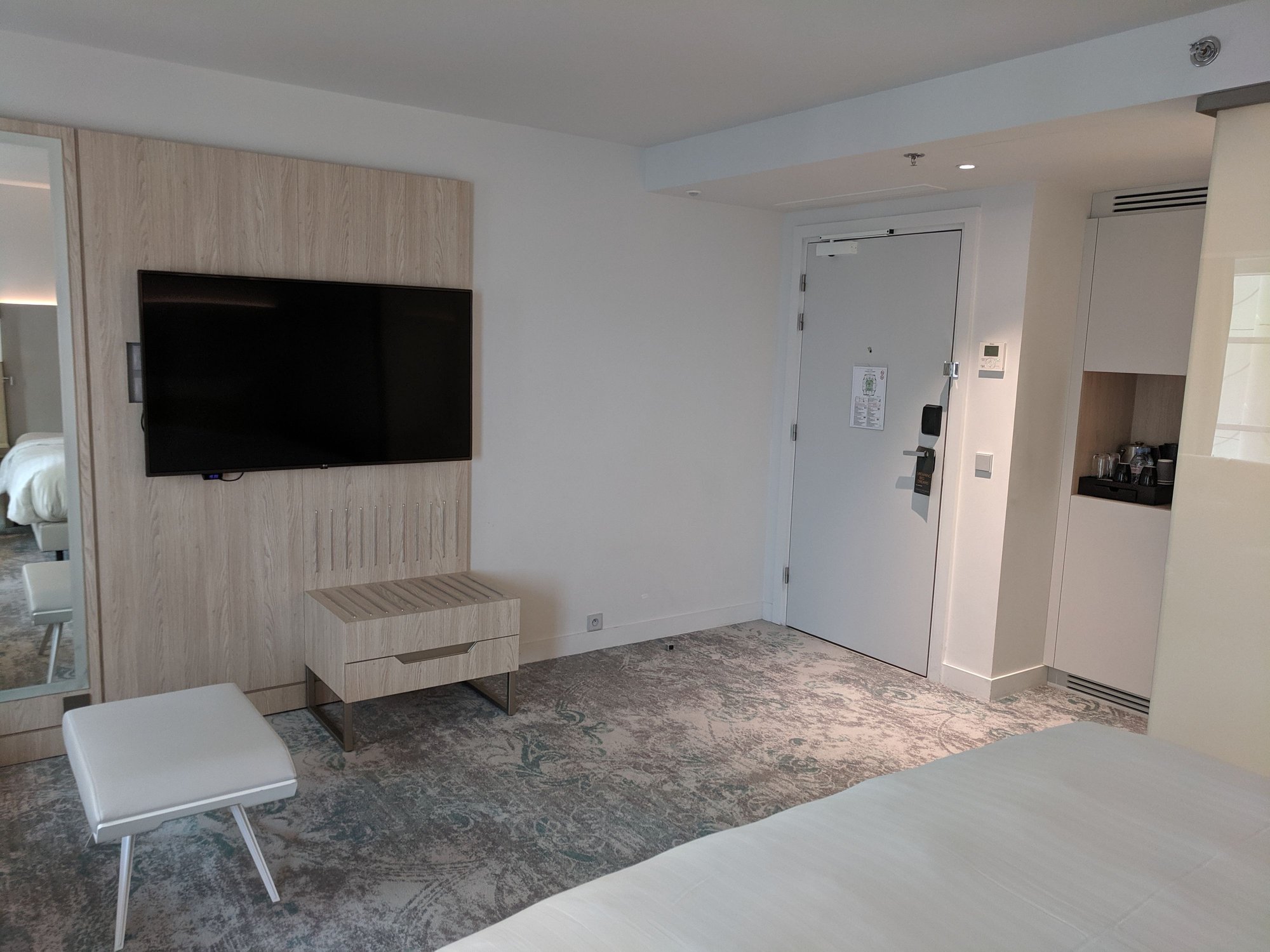 Room: Large, mine had a nice view of the station. Totally new color palette—beige, blond wood, off-whites, chrome steel with almost no color besides the throw pillows. Feels a bit like living in one of those very neutral IKEA sample rooms you see at the stores. Bed seemed standard, sofa was comfy, bathroom was standard.