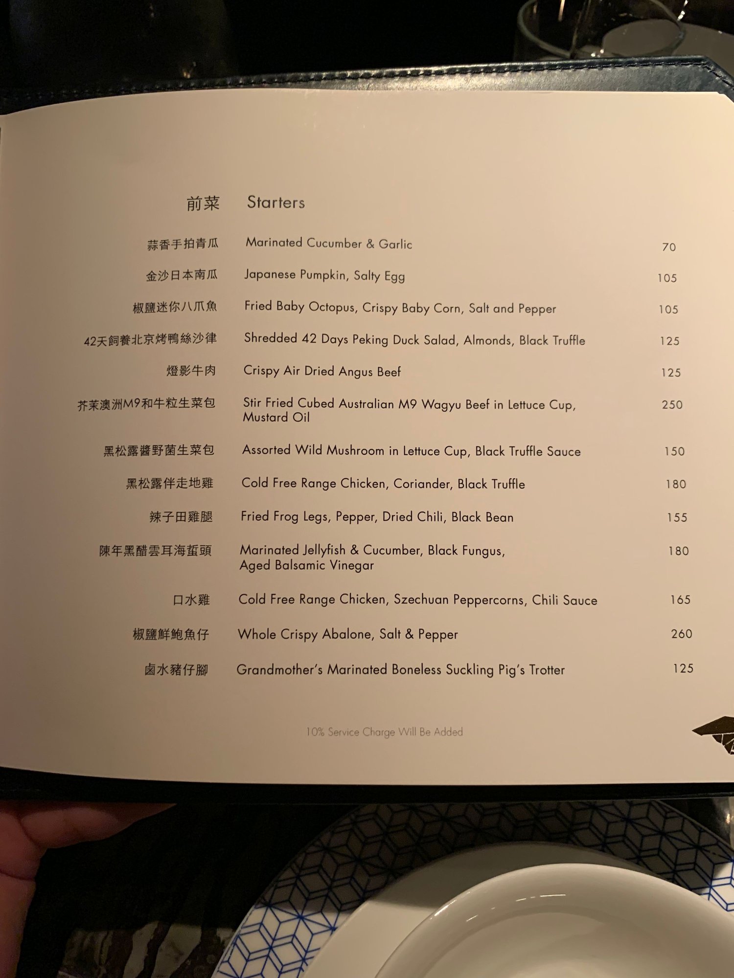 After couple hours of rest and unpacking, we headed over to Mott 32 (link). Mott 32 is located in basement of the Standard Chartered Building in Central. I’ve been to this restaurant more than I can count but my wife was looking forward to this restaurant the most since her favorite thing to eat is probably Peking Duck. Mott 32 calls it self an “contemporary chinese” restaurant which focuses on Cantonese food but also injecting some Beijing/Szechuan dishes. They emphasize on the quality of the ingredient and they work extremely closely with farms/vendors to source local ingredients. As you can probably imagine, all of this comes at a price.