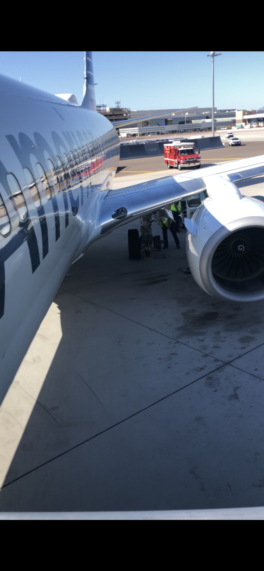 One of the tires being changed as we deplaned; plane is still on the tarmac