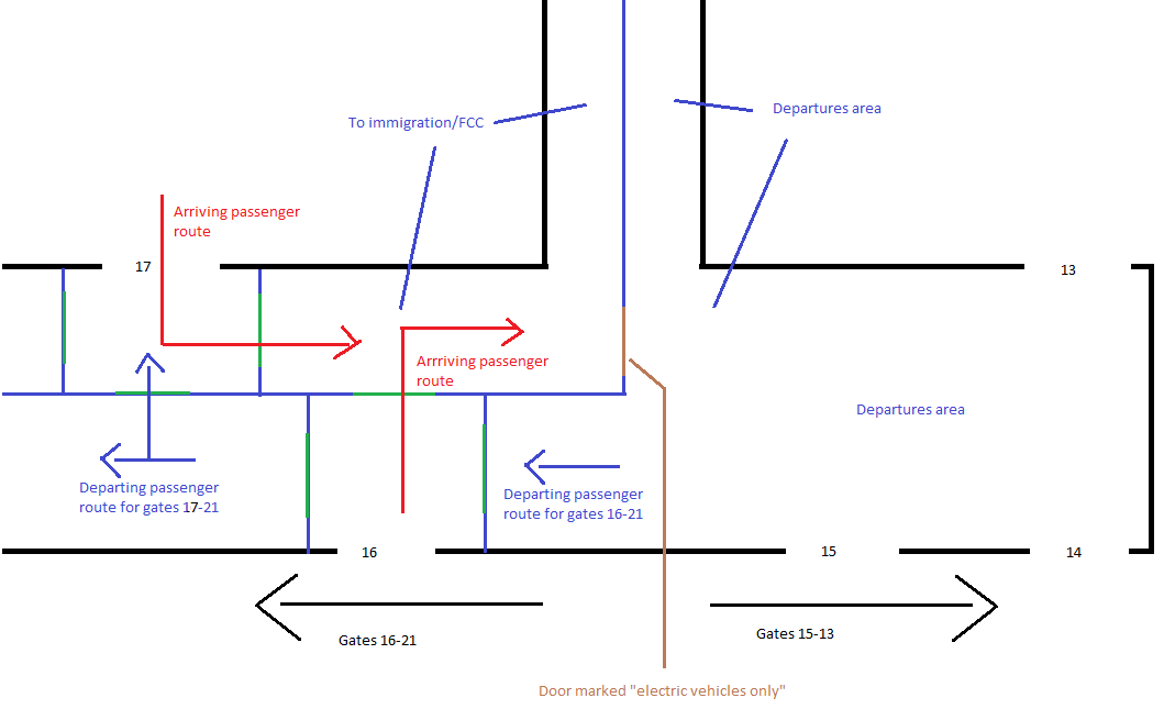 But I spent a bit of time looking at gates 15 through 13, and wondered how arrivals into those gates reach the arrivals corridor! I don't think I've ever used those gates (I don't think BA flights often go from them!). I noticed there is a door leading through the arrivals corridor and into the departure lounge toward gates 15-13, but that's marked "electric vehicles only" so I can't believe that is the route. It doesn't look like there is another floor - although appearances may be deceptive..!