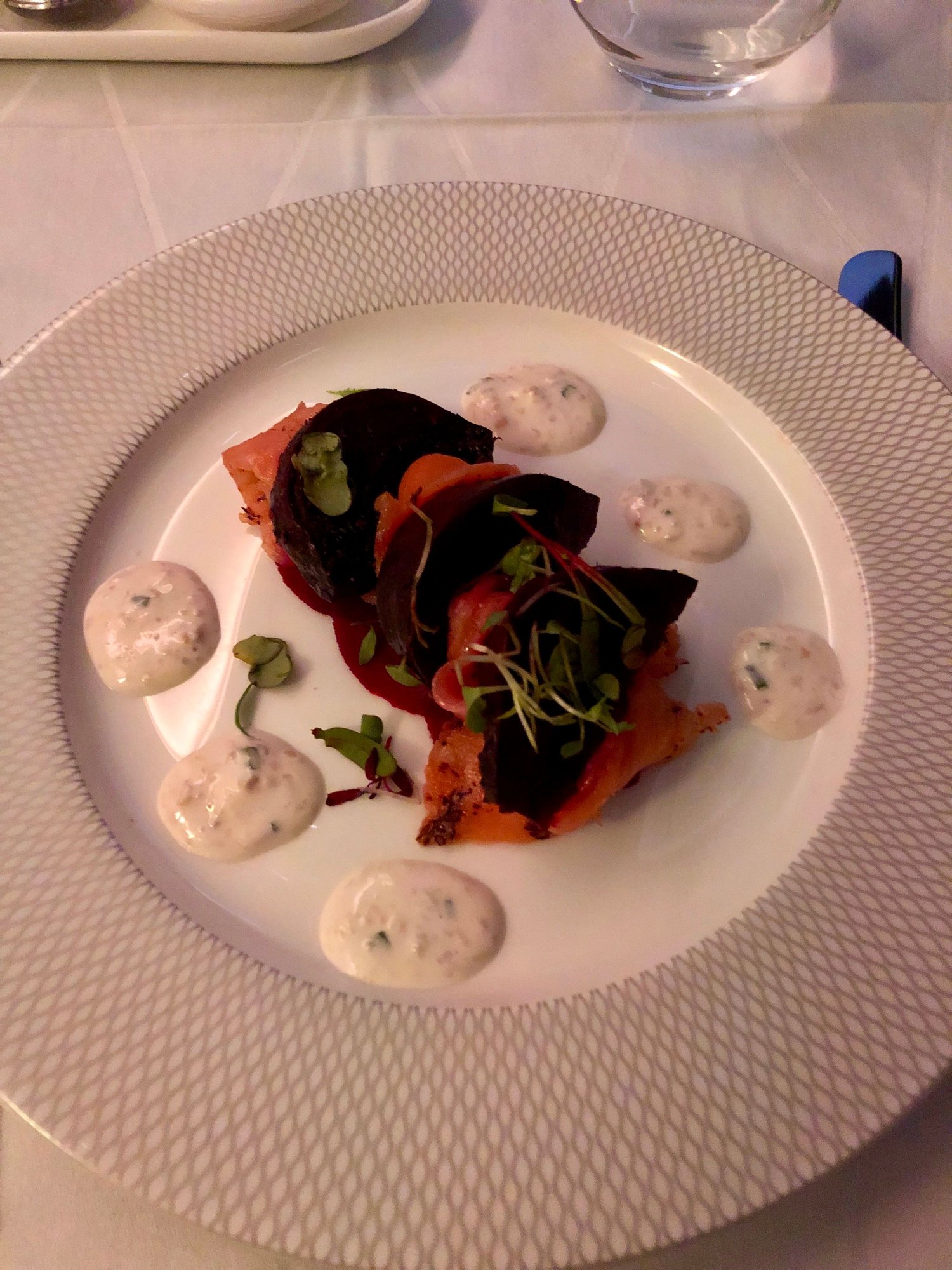 rooibos tea salmon with pickled beetroot and horseradish creme fraiche (my second choice was the beef biltong, pea and mint salad)