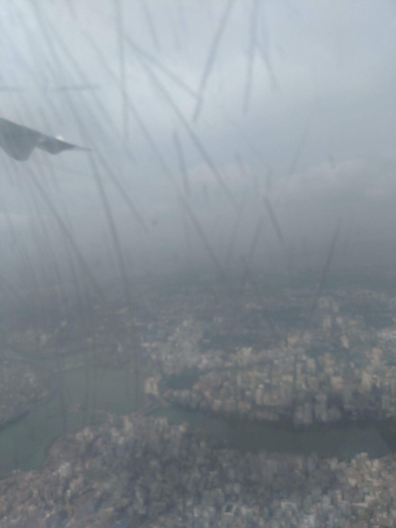 We soon took off -- the sprawl of Dhaka was -- sort of -- visible through the (scratched) window: