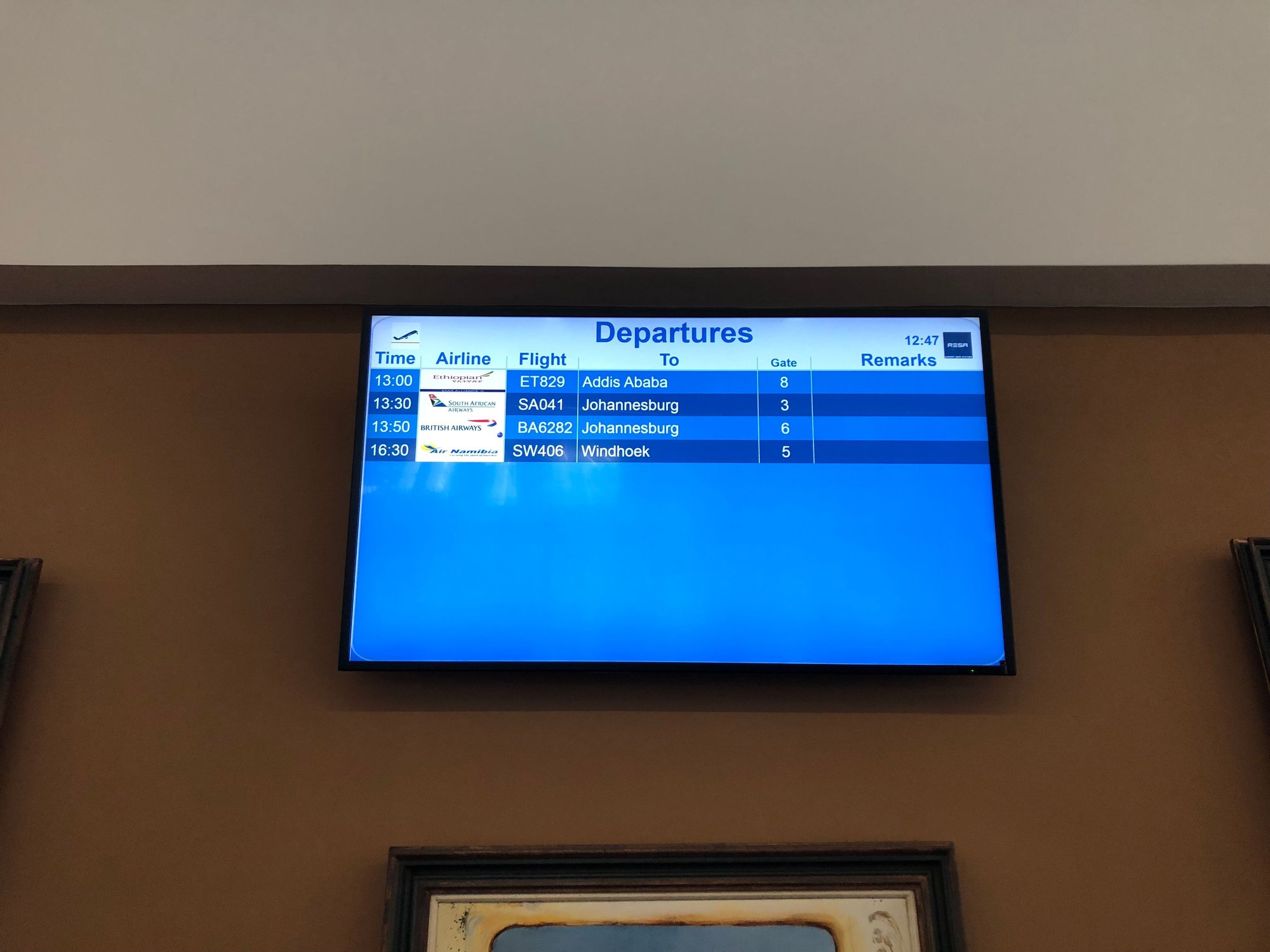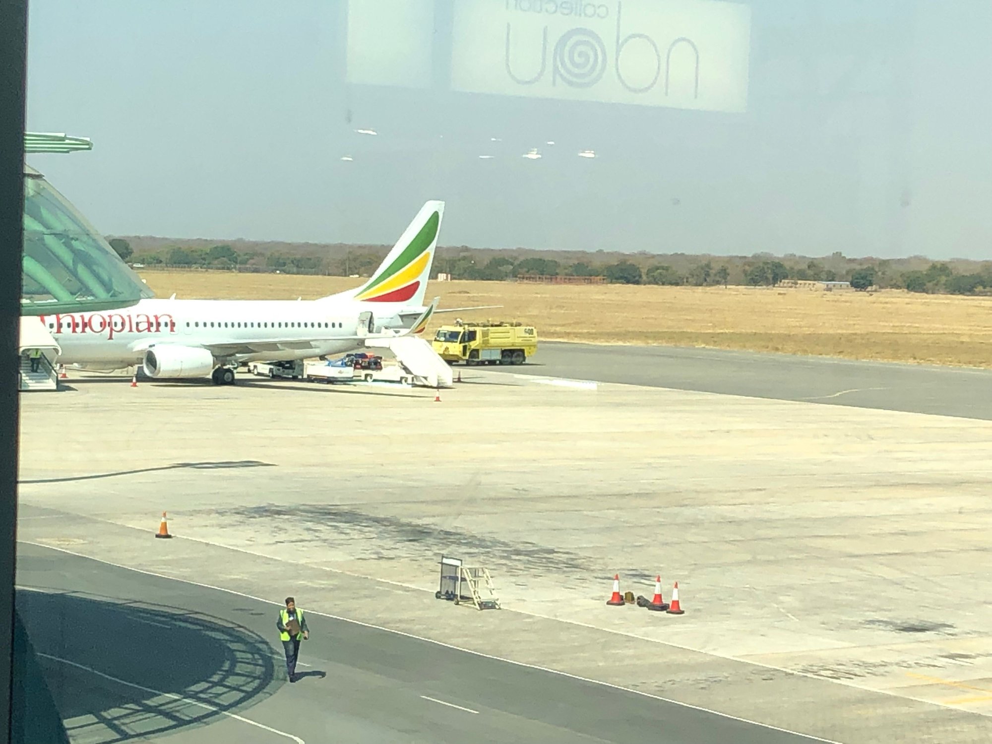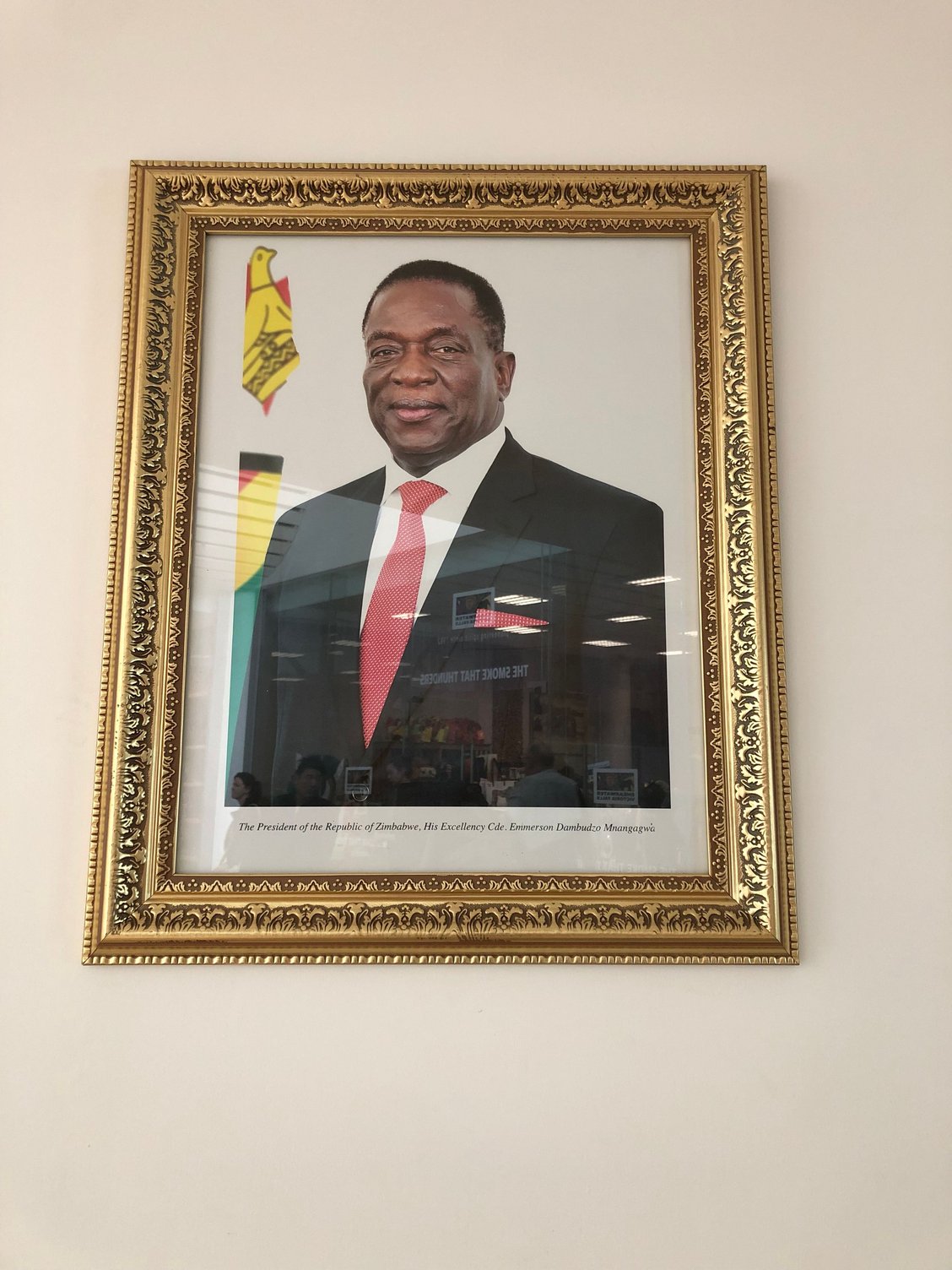 Eventually I made it through security, which was a kind of hybrid “all shoes and belts off but we have no interest in your liquids” affair; there was only an X-ray operator, no other employee at the end of the belt so I’m not even entirely convinced that if anything had been spotted it would have been challenged. Then through immigration with an extremely personable officer and portrait of the new president and I was officially no longer in Zimbabwe