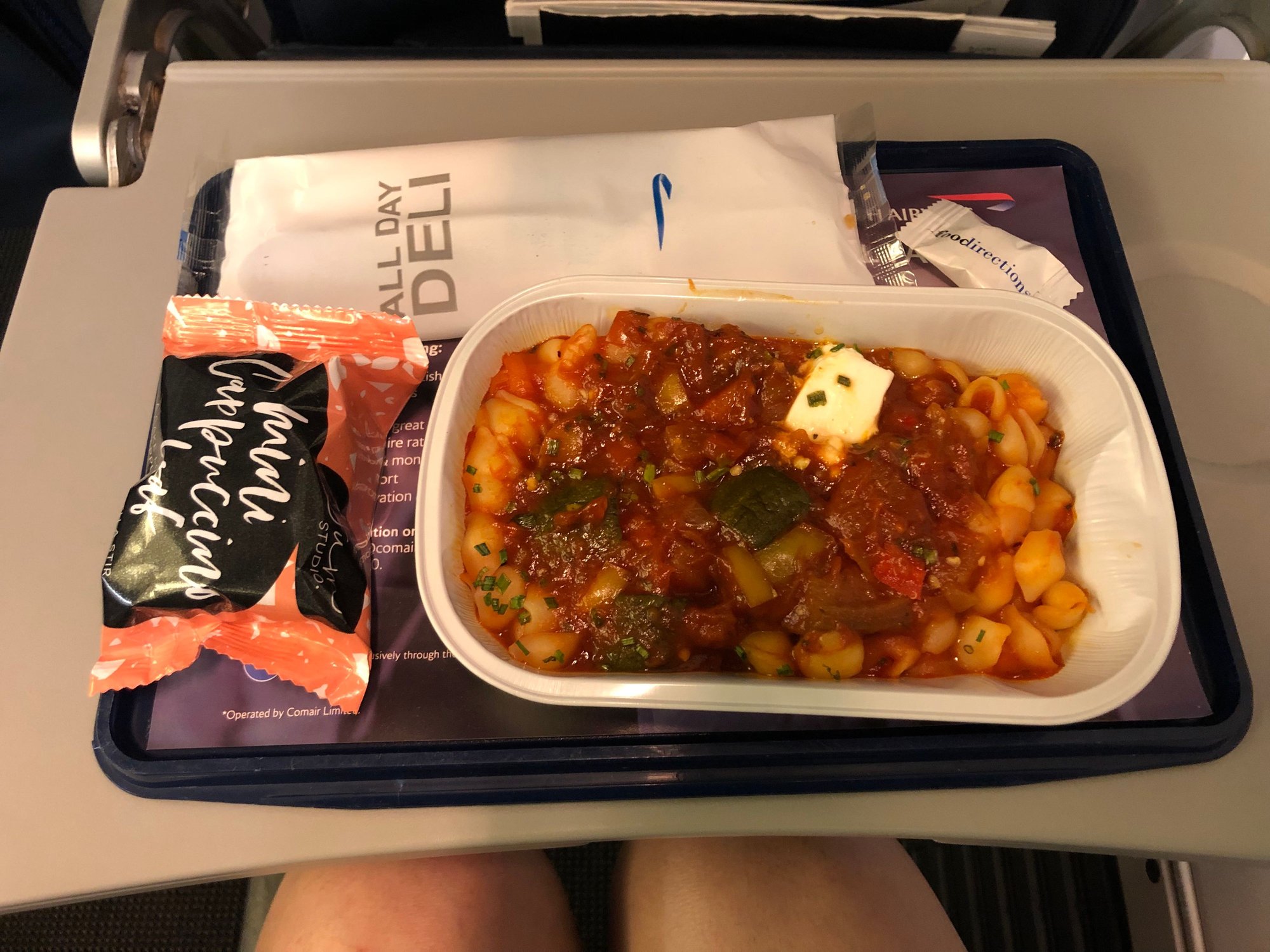 A longish flight, we were again fed a choice of chicken stroganoff or ratatouille pasta. For research purposes I went for the pasta. It was cooked to a nice al dente but the ratatouille was extremely sharp and the one piece of feta cheese might as well have not bothered showing up