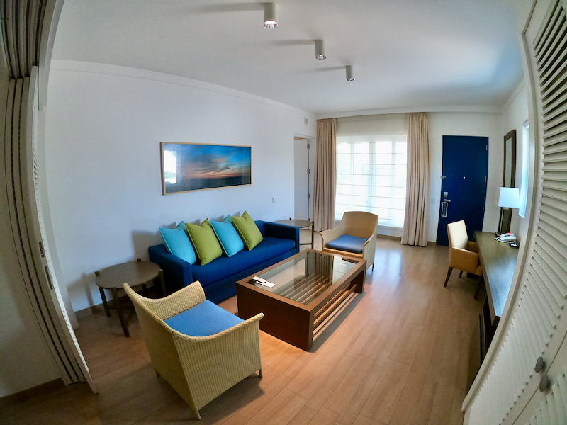 The Solarium Suite features a king bed, large bathroom with shower and tub, living room, and guest bathroom. A small empty mini-fridge safe in each room. The living room is basically the same as the bedroom, though it has a wet bar and a much smaller full bathroom. Every night there is turn down service, though they don't actually turn down the bed or put out slippers. It's pretty much setting the lights, refreshing waters, light cleaning, and putting chocolates on the pillows. The bed is on the firm side. At night there was a strange noise every 30 second which sounded like an empty soda can being placed firmly on the ground. It was extremely annoying and after three nights we could not determine where it was coming from (not the A/C). Otherwise the room was comfortable.