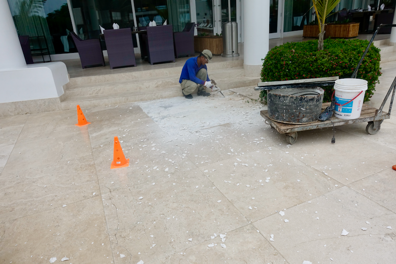 Around 11am they started demolishing tile. I'm not sure why they couldn't do this very early morning before guests were around as there was no motorized machine to make noise. When I asked the GM he said they had to do it ASAP as there was a safety issue. Seems like they were creating more of a safety issue..