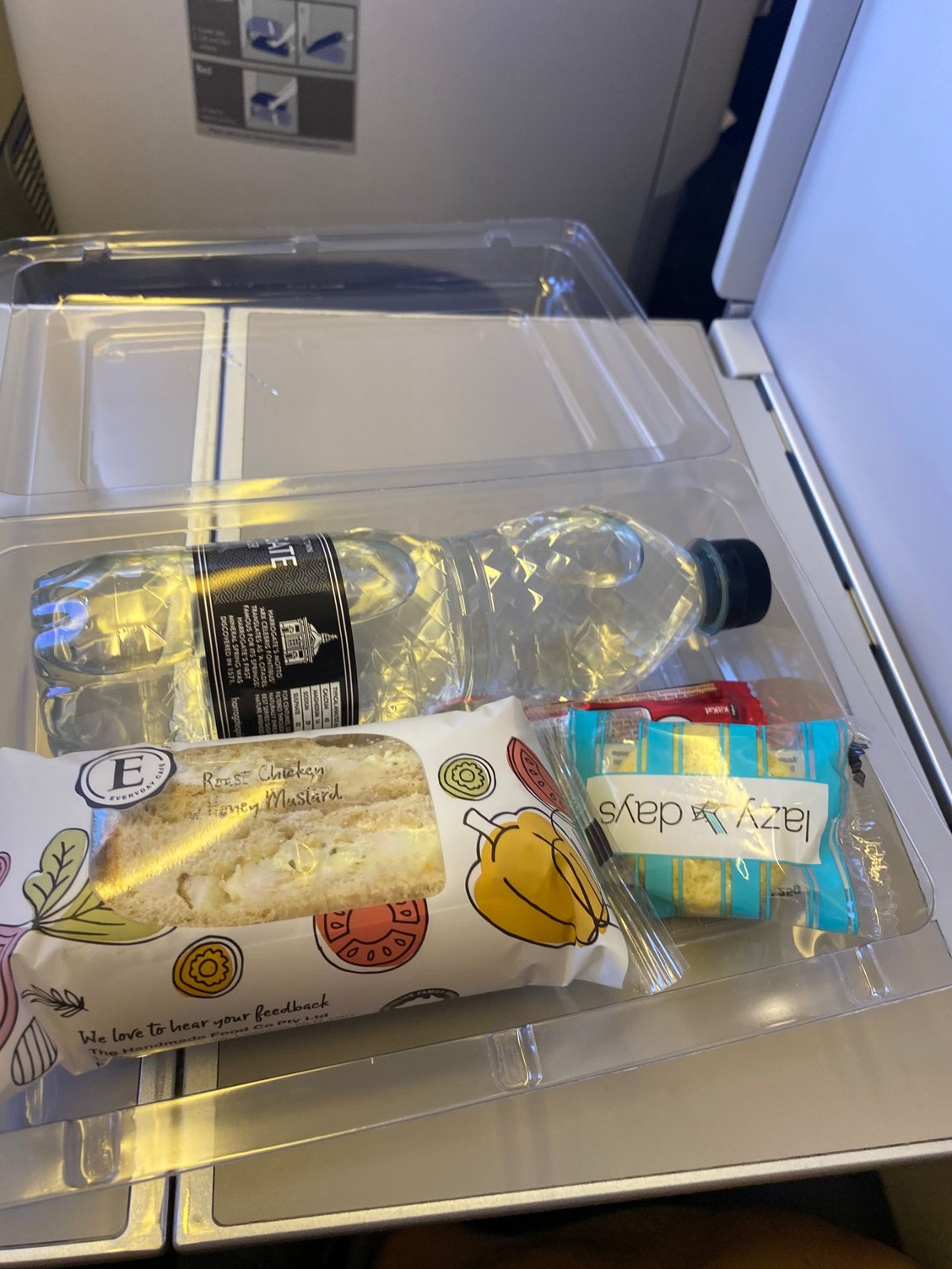 hour flight snack pack. If you was lucky you would have got 3 of them for the 24hr flight (I got only 2). My advice would be to bring as much food you need to eat for 24hr. Pot noodles are a good shout.
