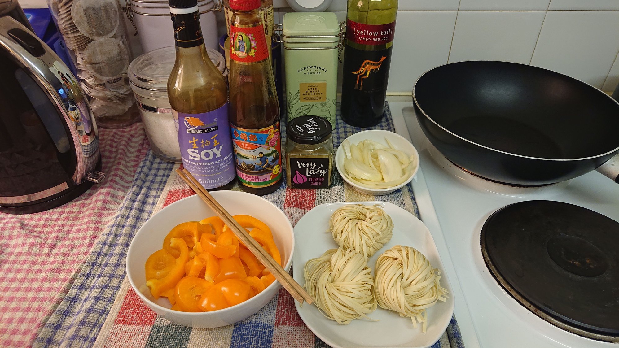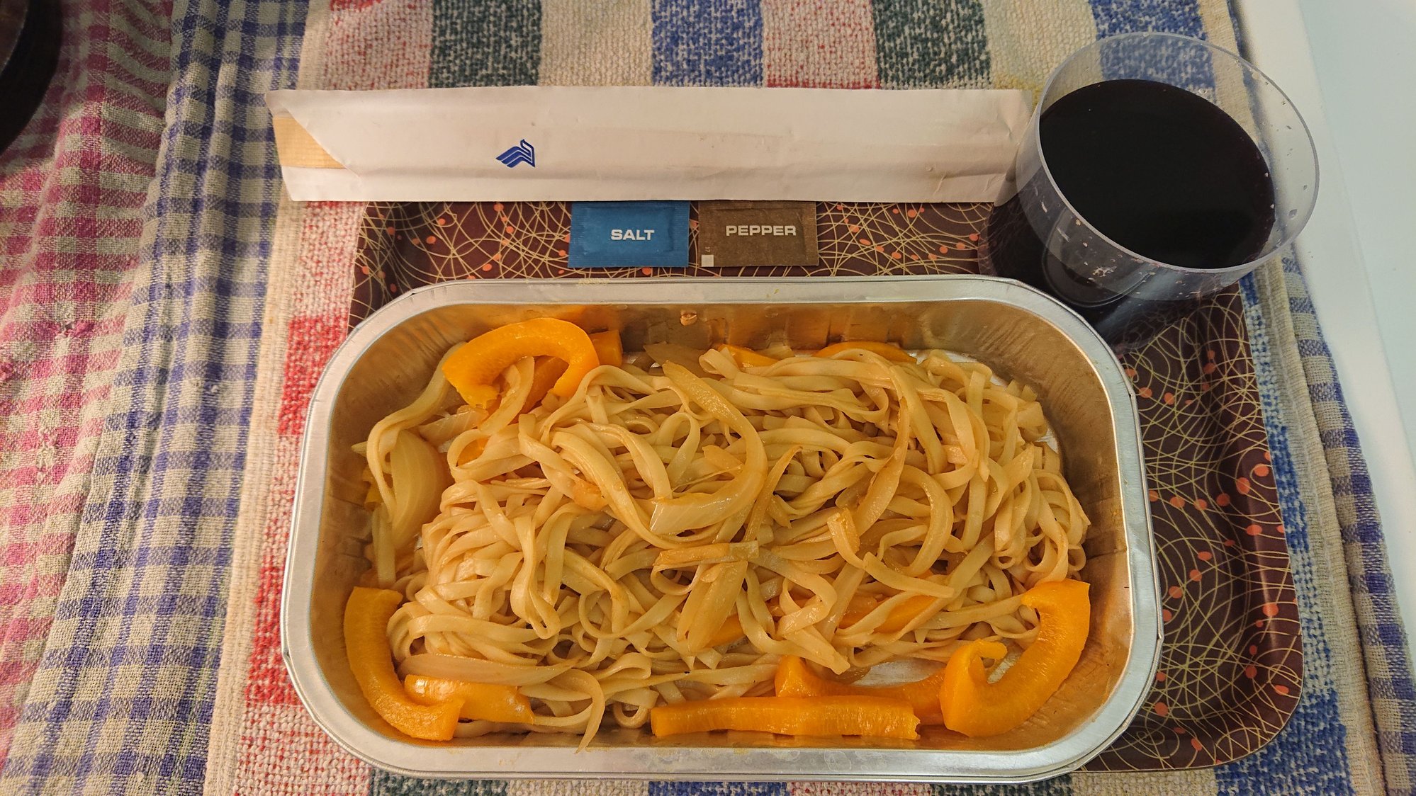 Economy class vegetarian meal served prior to landing, stir-fried egg noodles in Oyster sauce.