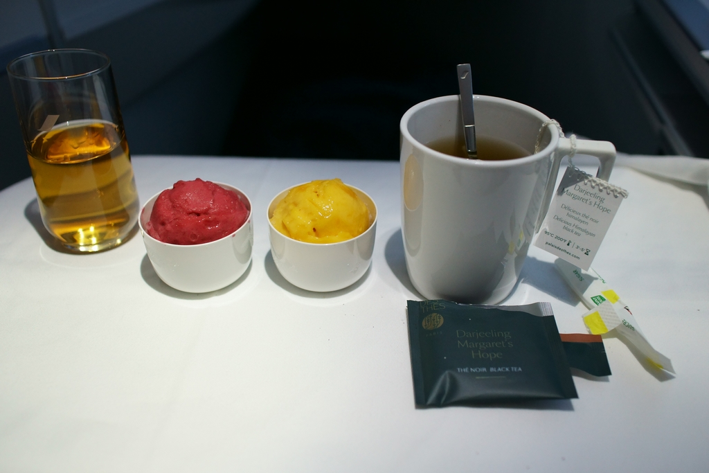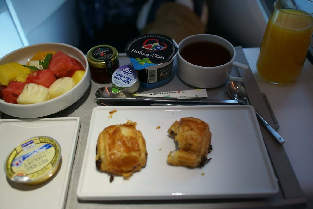 The most fustrating moment popped up when ATCL's unique 787 parked next to us 10 min before pushing back. (Info revealed by an official in JNB, said too low loads prevented from operating the planned wide body on this inaugural). Our cute cabin leader came in no time to suggest a PDB – tropical juice, water or a strong yellowish so called champagne!
