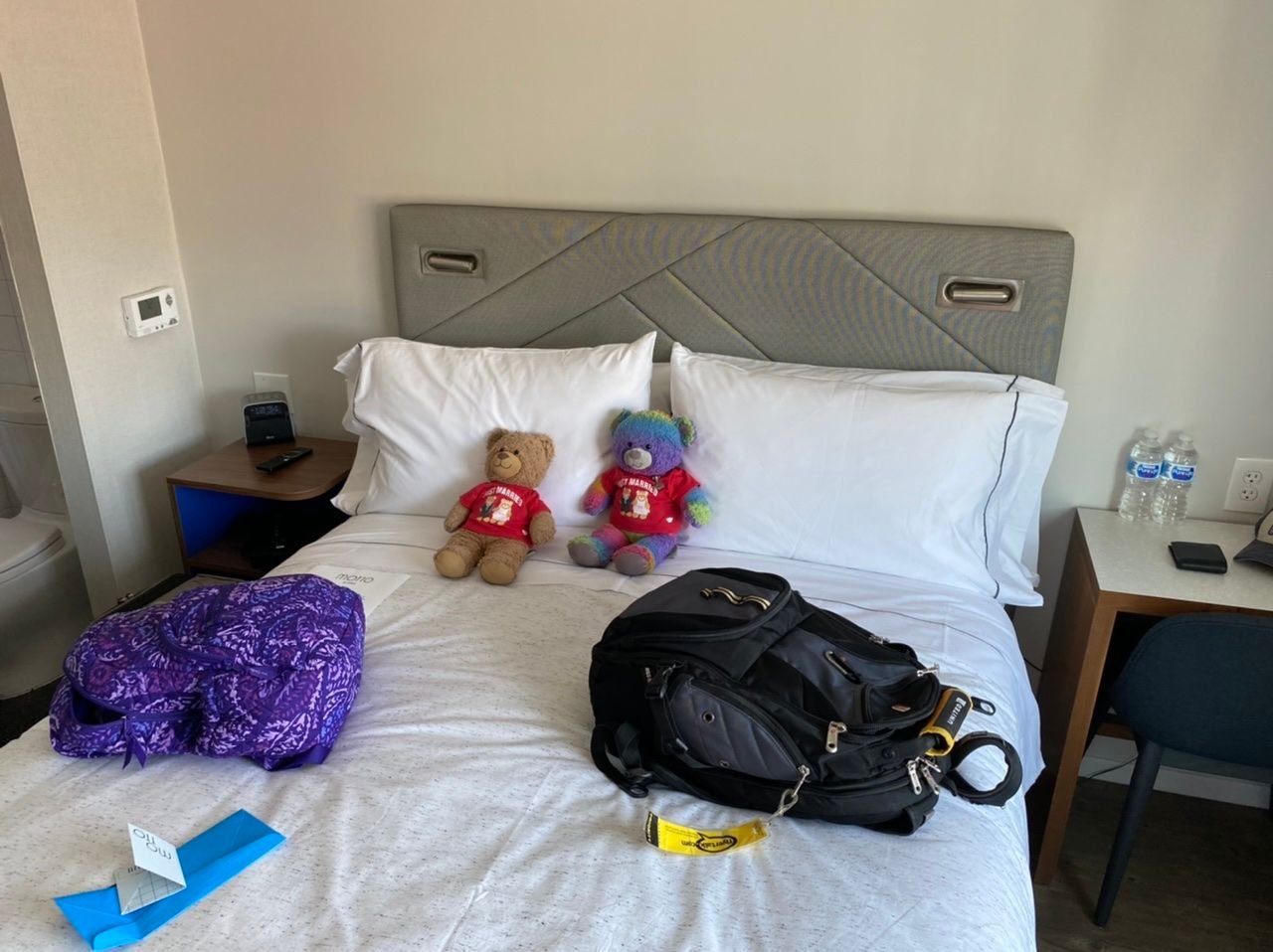 We booked a Queen bed - the only options are bunk beds, a full bed, or queen. You can see the small bathroom off to the side here as well, but there is not much room at all in between the bed and the walls.