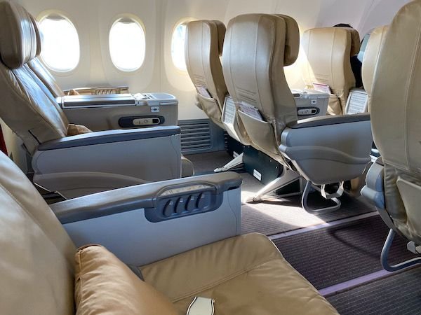 In terms of seats, they look nearly identical to the typical business class seats in North America, except they have a lot more legroom and equipped with leg rest. The cabin also seemed very well cared despite being six years old.