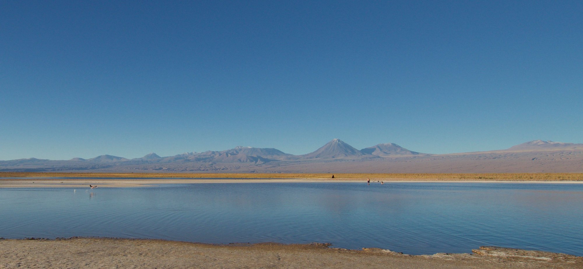 Cordillera de la Sal and the volcanos mirroring in the perfectly still water of the ponds. This is one of the few places where bathing is allowed but, this late in the day, it’s almost only us: the bus tour brigade has already returned back to base.