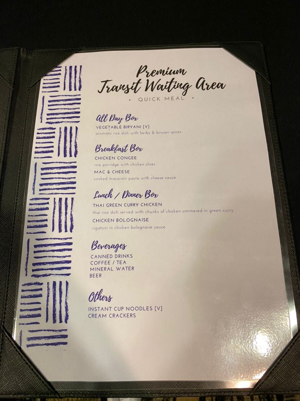 Transit in SIN - given a wristband and taken off to a converted boarding gate. Very basic food/drink offerings - definitely not your silverkris experience! Fridge with water/coke/hieniken, hot water urn with tea/instant coffee. Tiny food menu with tiny portions (about 3 mouthfuls for the thai chicken curry)