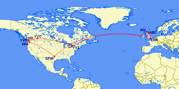 New airports: INV, DFW, SEA, CXH, YVR, YYC