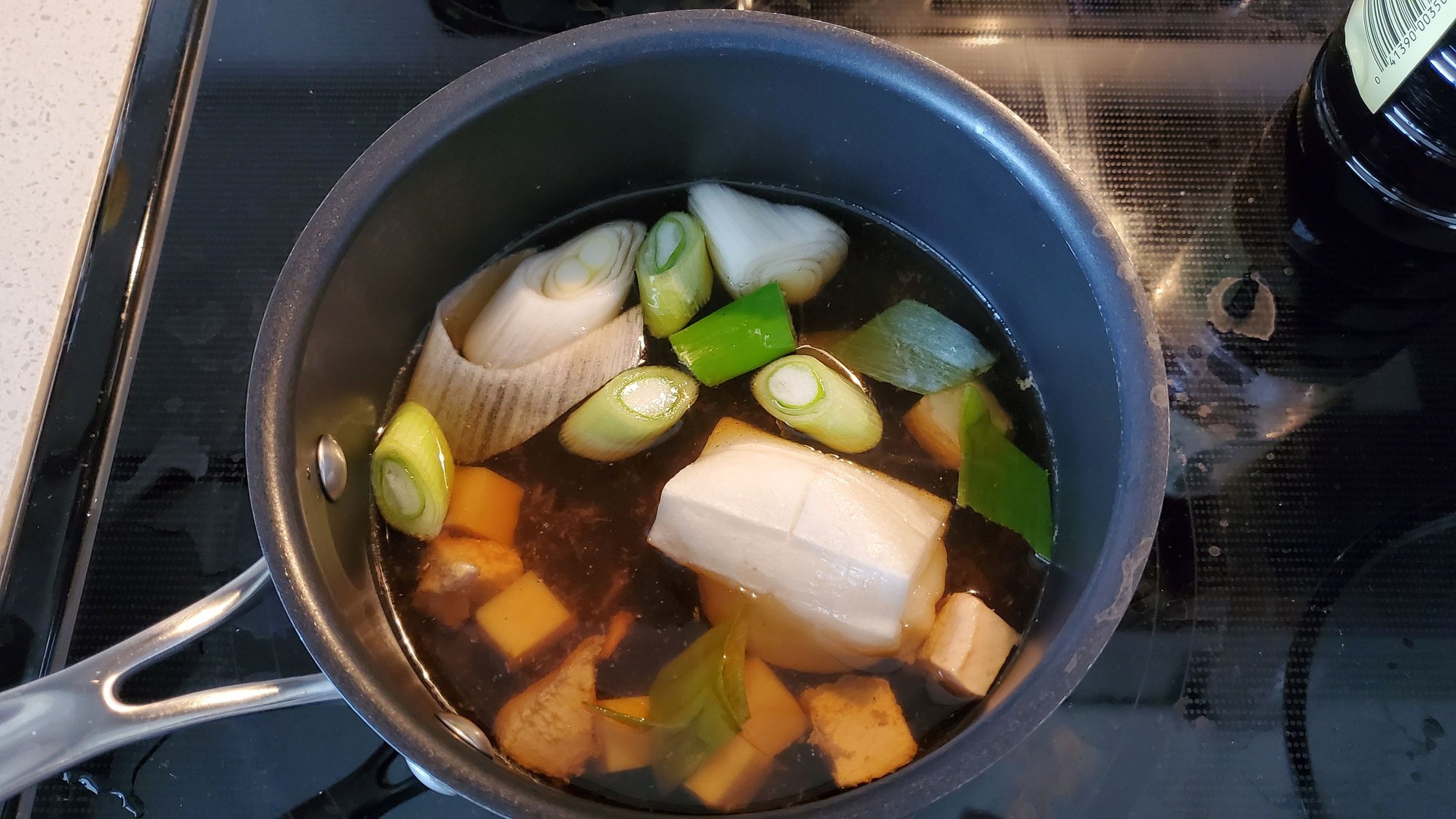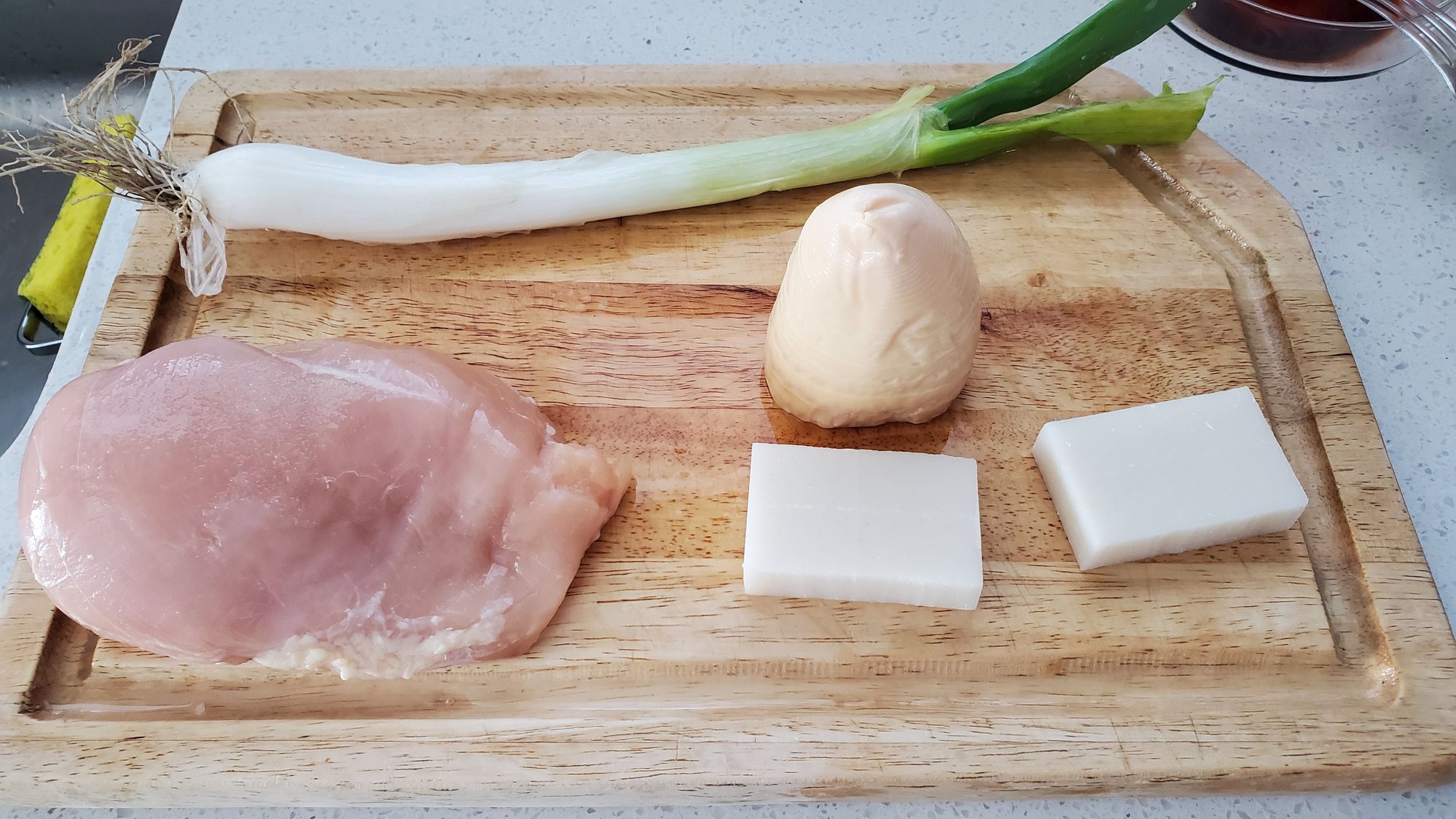 Once chicken is cooked then add mochi, bamboo shoot, and long onion. Simmer for another a minite or so.