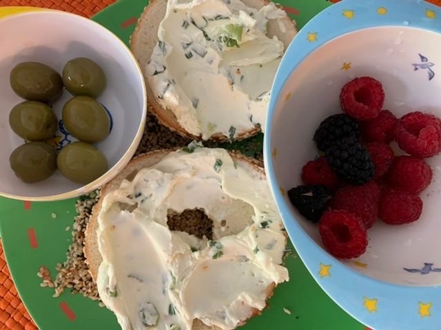 I earlier prepared a wise sons sesame bagel with chive cream with green olives & berries for my spouse.