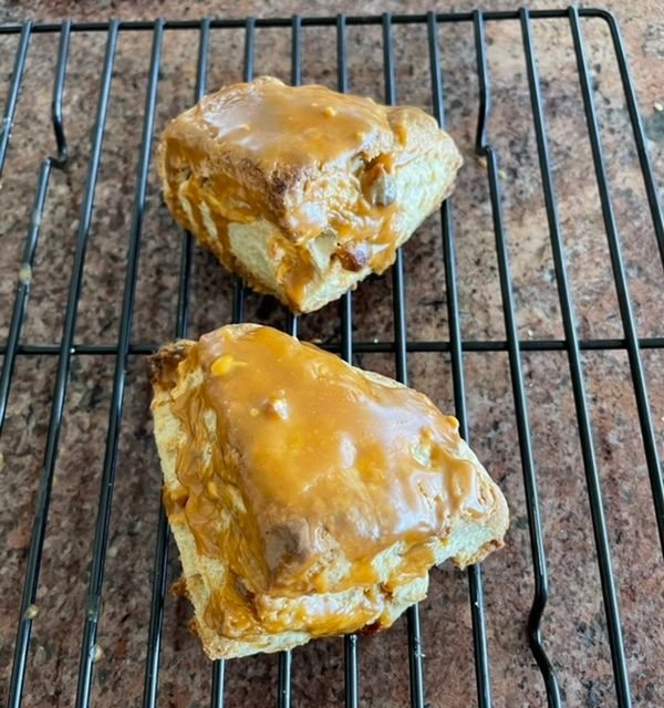 My cousin did me a favor and wondered if there were cookies. The best I could do was Irish Cream scones with a Bailey’s/butterscotch glaze. It's great to keep frozen scones in the freezer. When the mood strikes, you can get them out while the oven is preheating.