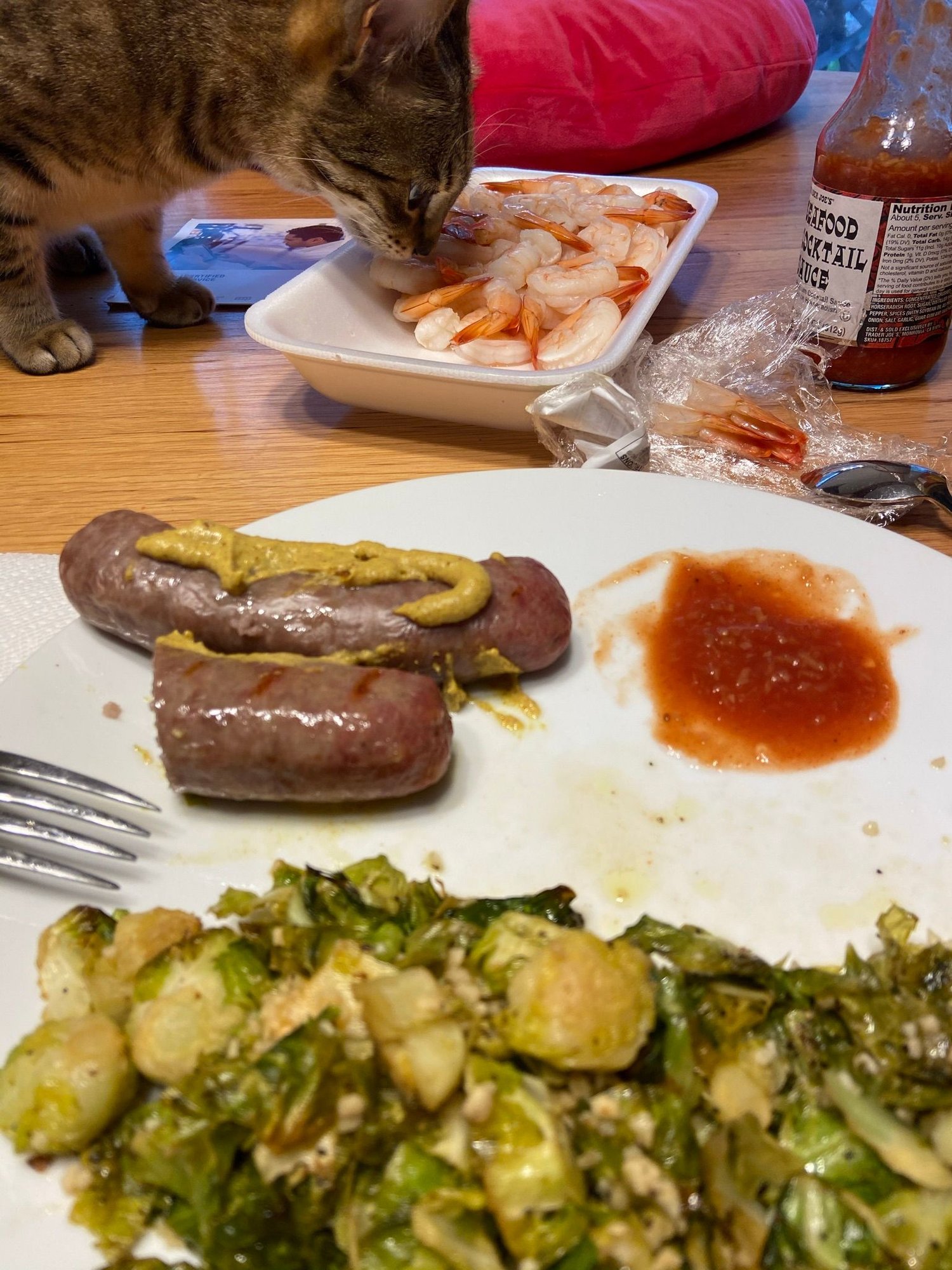 Beer brats with deli mustard, roasted Brussels sprouts with garlic, cocktail shrimp with Trader Joe’s cocktail sauce. One of the cats inspected the shrimp for quality assurance.