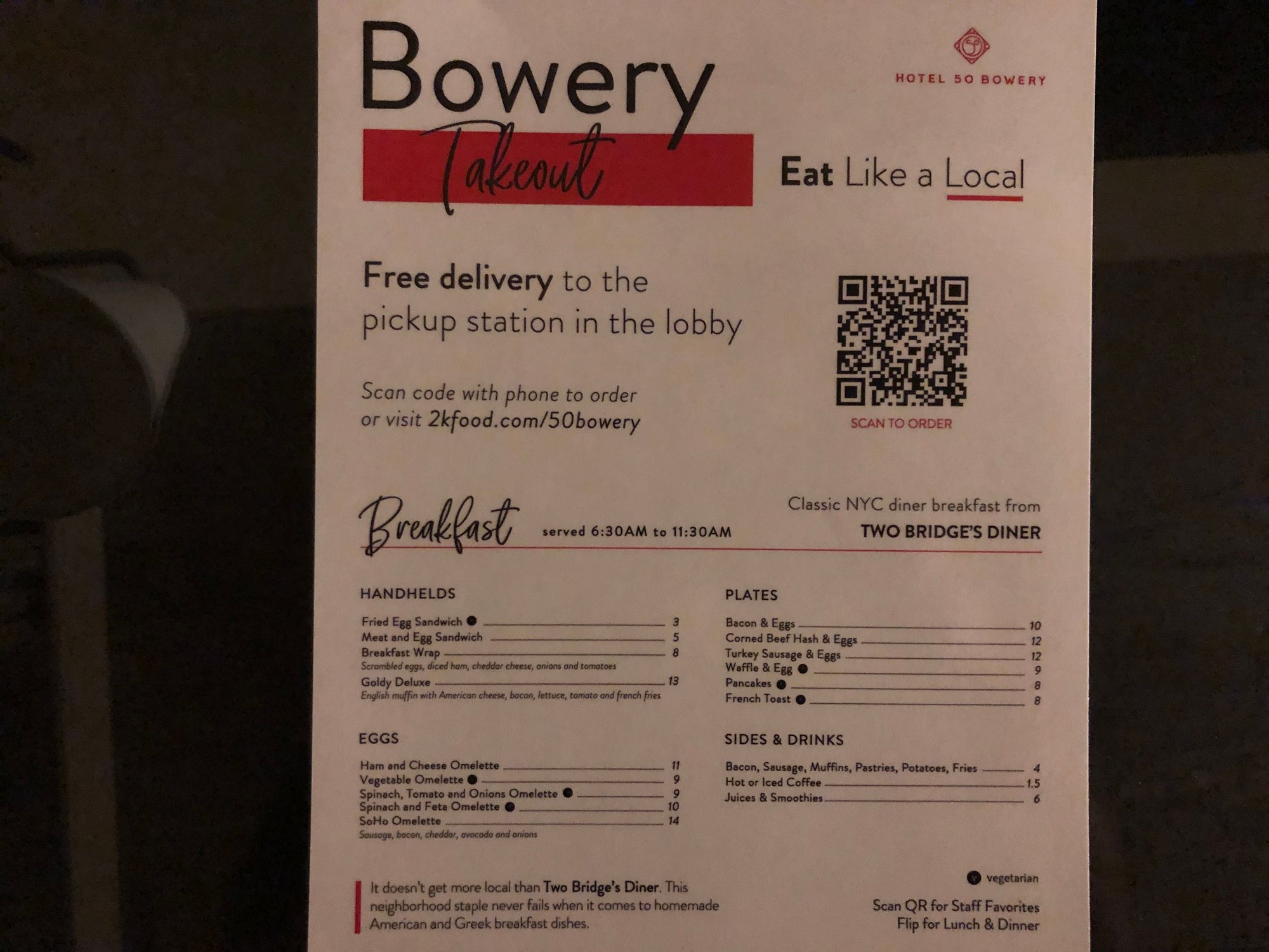 Two Bridges Diner is available for ordering from 6:30am to 11:30am. Then Jing Fong is available for ordering from 11:30am to 7:45pm, so really more brunch/lunch. You don’t need to inform anybody at the hotel.
