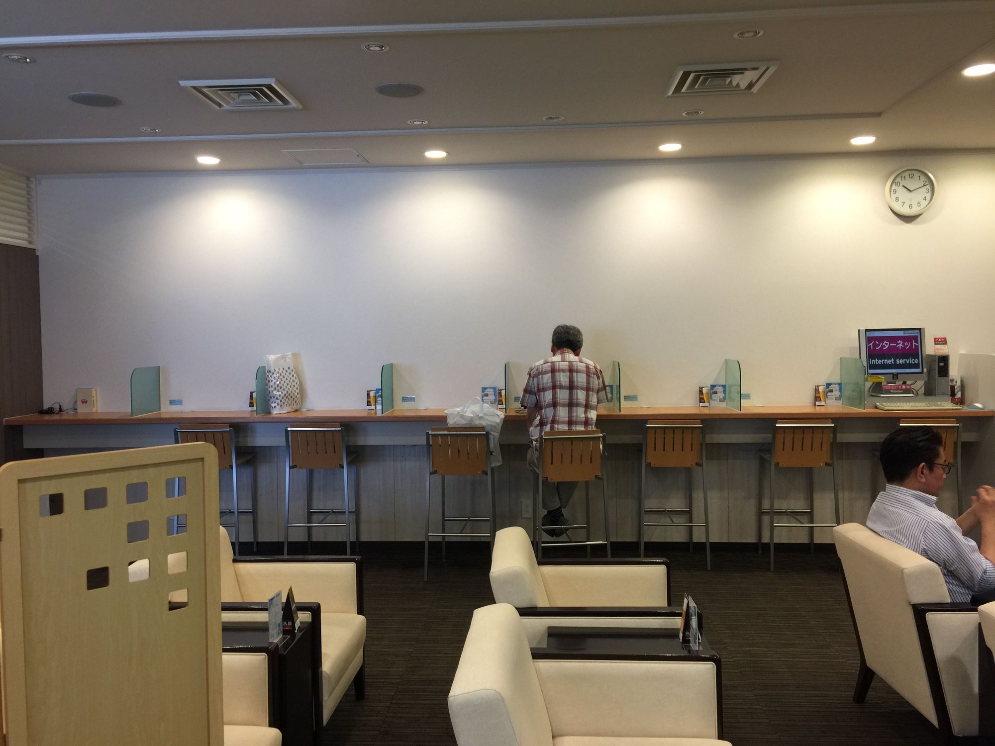 The lounge offers a wide assortment of non-alcoholic drinks for free but there is virtually no free food available other than small packs of rice crackers, IIRC. Alcoholic drinks and some food items are available for a fee (beer is 600 yen). Although a Starbucks is located just around the corner from the lounge entrance, you are not allowed to bring food in from the outside and eat it in the lounge. I did this once and was told not to.